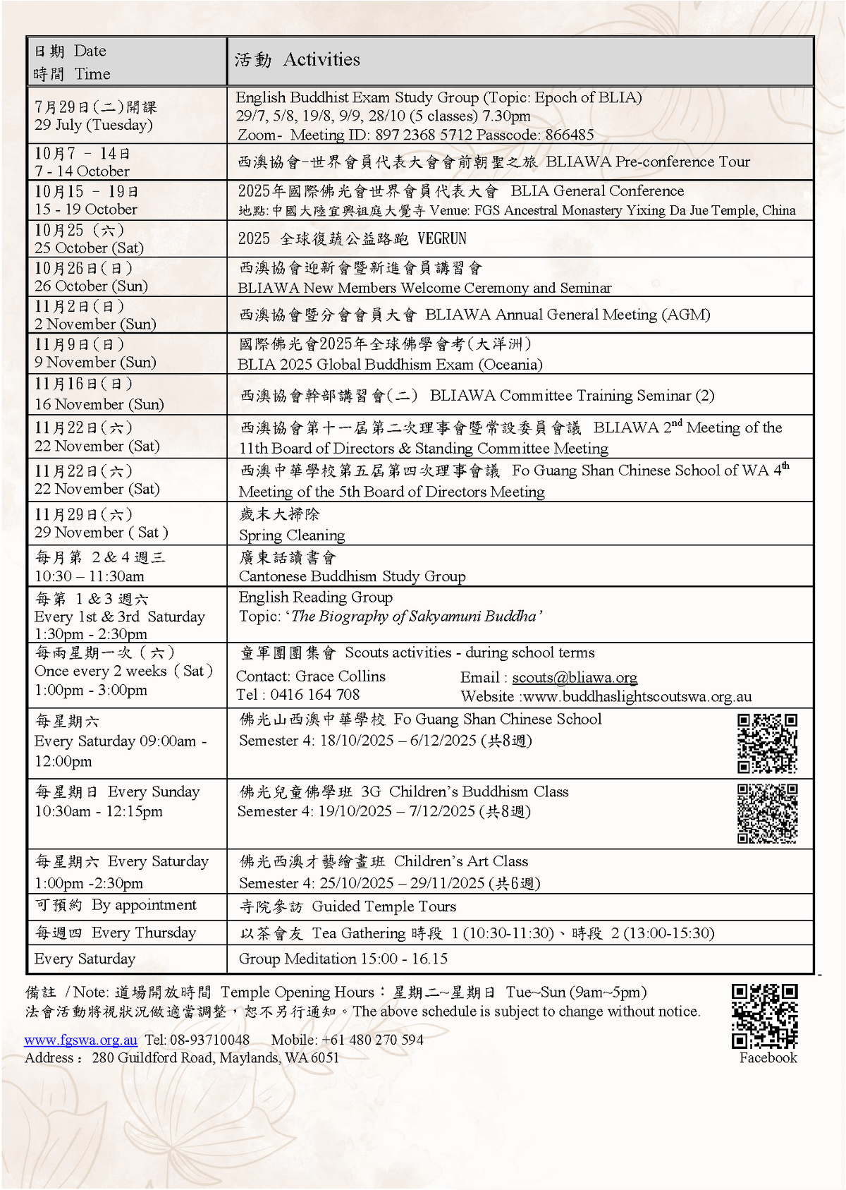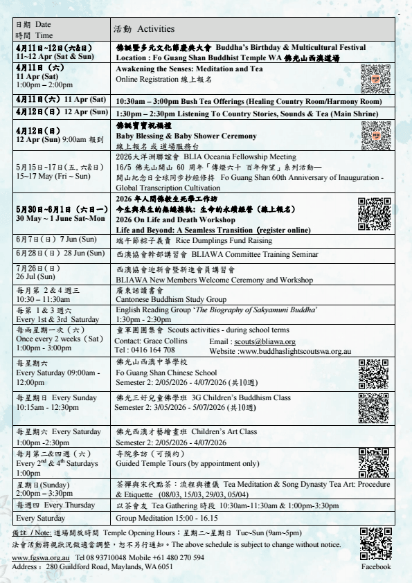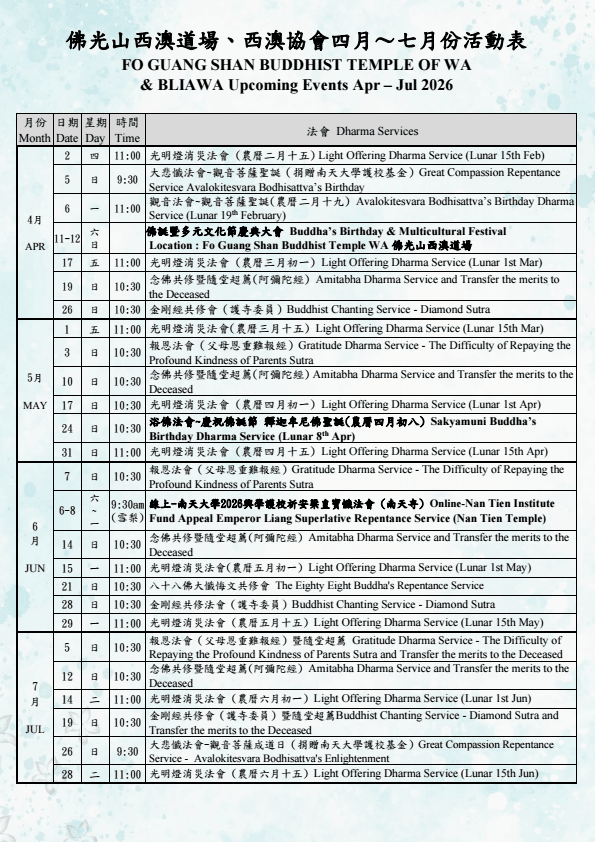 For information andbookings, please visit Fo Guang Shan Buddhist Temple WA
